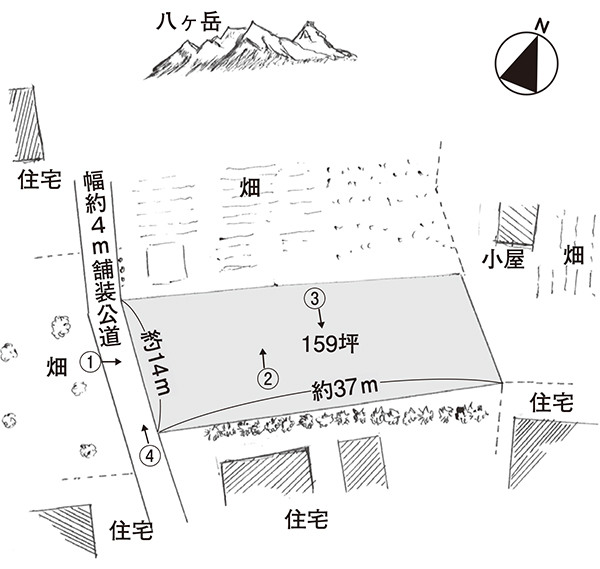 中央道長坂インターから県道32号線を東方向へ1km程進み、脇道を南へ400m程下った場所にある土地。周囲は畑と住宅が混在する長閑な雰囲気のエリア。接道は車の通行が極端に少なく静かな環境だ。約159坪の敷地は畑として使われてきた。平坦な地勢で、長方形の整った形状だ。敷地の北側方向には優美に裾野を広げる八ヶ岳の姿を望むことが出来る。スーパーへ約1.4km、コンビニへ約900mと徒歩で行ける距離にあるのも嬉しいところだ。小学校、保育園へも約1.1kmと近い距離にある。別荘から子育て世代の定住など幅広くお勧めが出来る。地目が農地(畑)の為、宅地への転用許可後のお引き渡しとなる。
