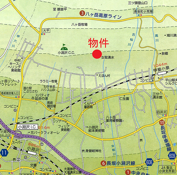 中央本線小淵沢駅より約5.1km、中央道小淵沢ICより約5.5m 車で12分
