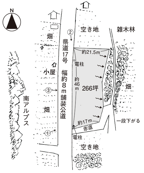 • 幹線道路沿い。南アルプスを望む266坪の土地。① 幹線道路沿い。南アルプスを望む266坪の土地。①