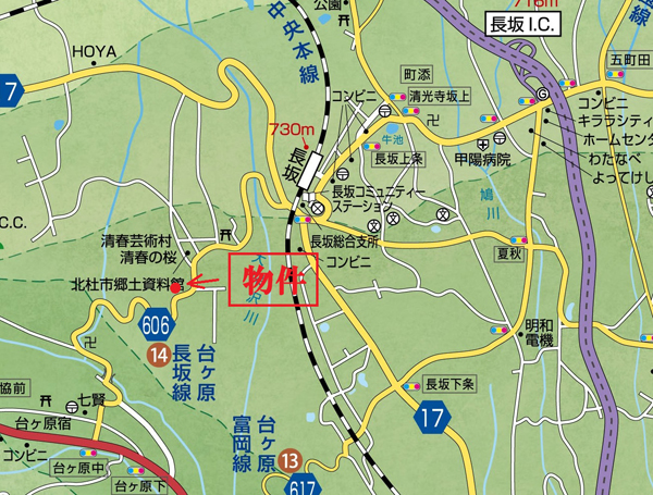中央本線長坂駅より約2.9km、中央道長坂ICより約5.3km 車で11分