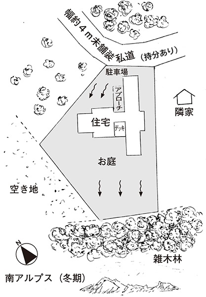 北側が幅約4mの未舗装私道に接する。(持分あり)