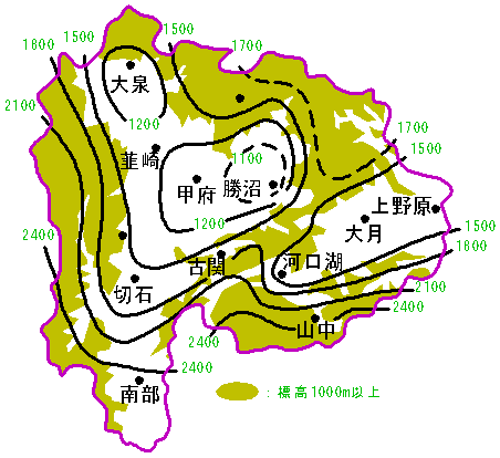 ▲標高と山梨県内の降水量(甲府地方気象台による)