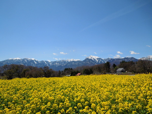 ▲晴天の青空の下、菜の花畑の先には南アルプスの眺め。(北杜市長坂町)