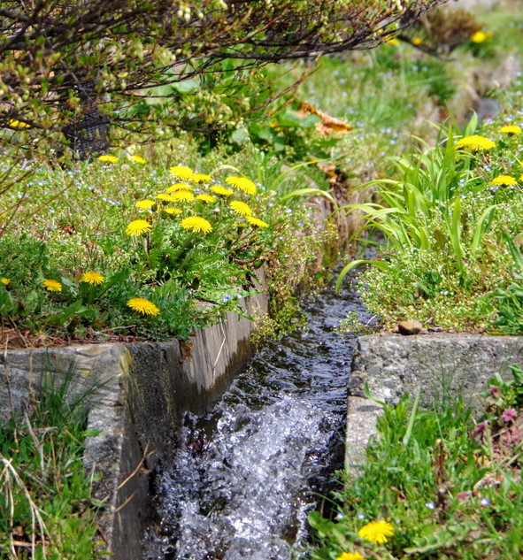 ▲田へ水を引く水路の脇には春の草花。(北杜市高根町)