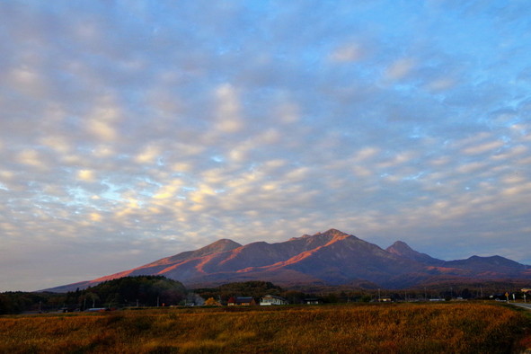 ▲秋空の下、夕暮れで赤く染まる八ヶ岳。(山梨県北杜市高根町)