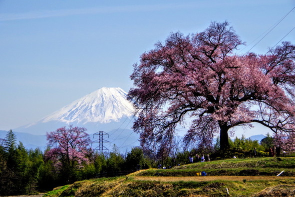 最初の見どころは、北杜市に隣接する韮崎市の「わに塚の桜」でしょうか。西側に山を背負い、緩やかな傾斜に棚田が広がるまん中に、大きな桜の木がどんと1本立っています。樹齢約330年のエドヒガンザクラ。桜の先には残雪を残した八ヶ岳や富士山の姿も見え、多くのカメラマンが訪れる人気のスポットとなっています。例年ですと満開の頃は3月下旬頃。見ごろの時期にはライトアップがされるとのこと。星空の下の夜桜、魅力的なシチュエーションです。
