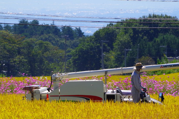 ▲稲刈りの季節。コンバインが駆けていく。(山梨県北杜市)