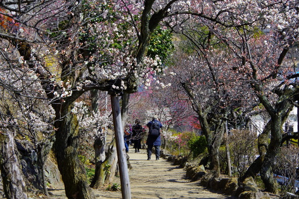3月の前半のこの時期、不老園において梅の花が見ごろを迎えます。不老園は、総面積約5万平方メートルの広大な山を切り崩し、谷を生かし、池をつくり、その周辺に30数種類、約2,000本の観賞用の花梅木や赤松、桜、南天、つつじ、もみじ、牡丹等が植栽されている梅園のこと。