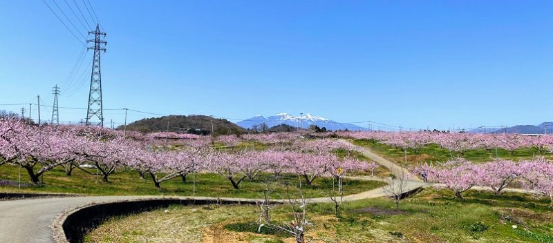 韮崎市中田町には出荷用の桃畑が一面に広がり、春になると桃の花見に多くの人が訪れます。ちょうど目線ほどの高さに選定された木にピンク色の花が咲き、あたり一帯が華やかな雰囲気になり、自然と桃源郷という言葉が頭に浮かんできます。
