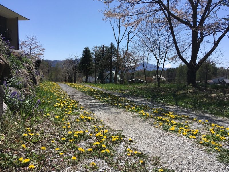 ▲タンポポで飾られた小道。(山梨県北杜市高根町)