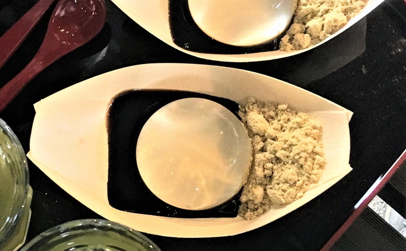 賞味期限が短いというのは、実物を見ると納得できるかもしれません。餅というよりはゼリー、ゼリーというよりは水そのもの、というのが私の印象でした。水が球状にまるまって存在を保っている。そんな外観です。金精軒のHPによると白州の名水を僅かな寒天で固めたシンプルな水菓子が水信玄餅です。それはちょっとの体の振動で、プルプルと震え、今にも崩れ、水に戻ってしまいそうな繊細さです。そんなお菓子を求め、夏の炎天下の行列に並ぶのも良い思い出になるでしょう。