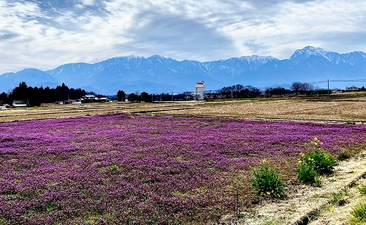 ホトケノザが広がり紫の絨毯に。奥に南アルプス。(山梨県北杜市)