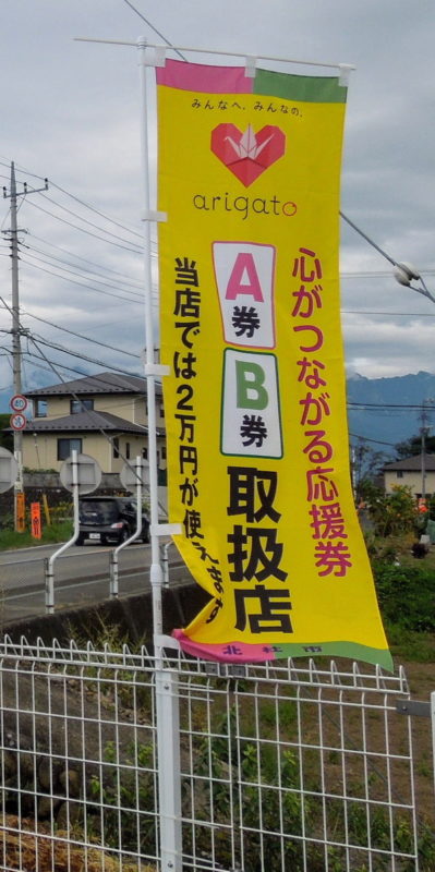 北杜市では現在、道端の至る所で黄色い「のぼり旗」を見ることができます。同一デザインのこの旗は、北杜市が発行した商品券が使えるお店の目印。