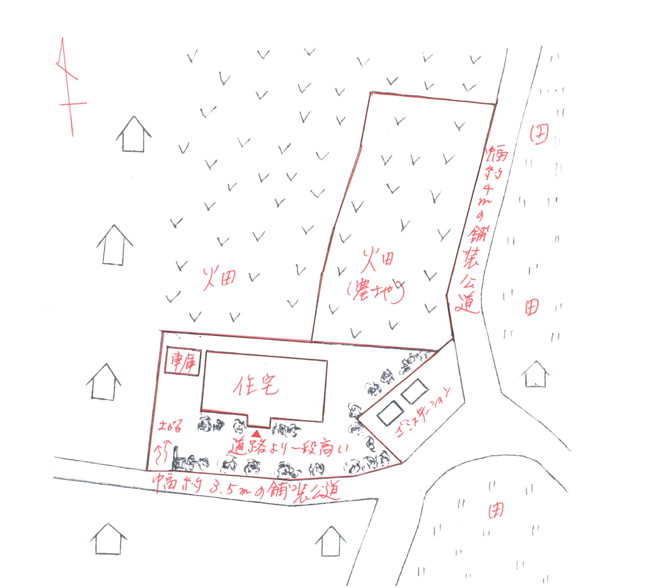 | 道路 | 南側が幅約3.5m、東側が幅約4mの舗装公道に接する。 | ||